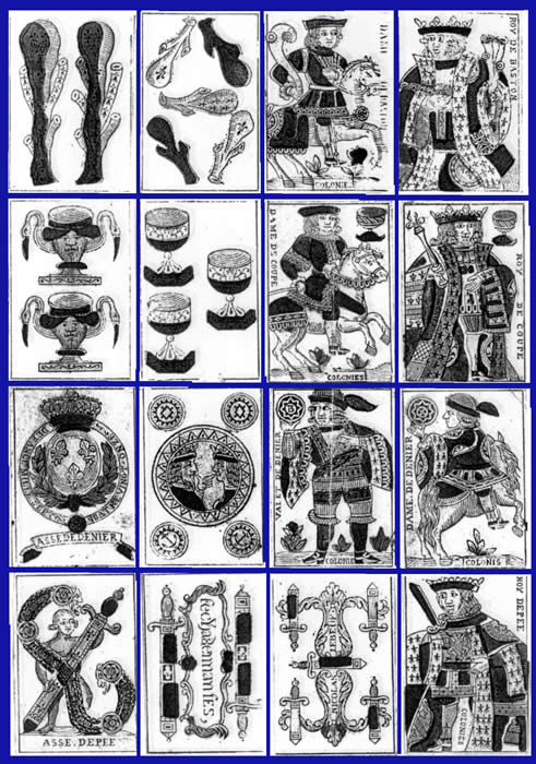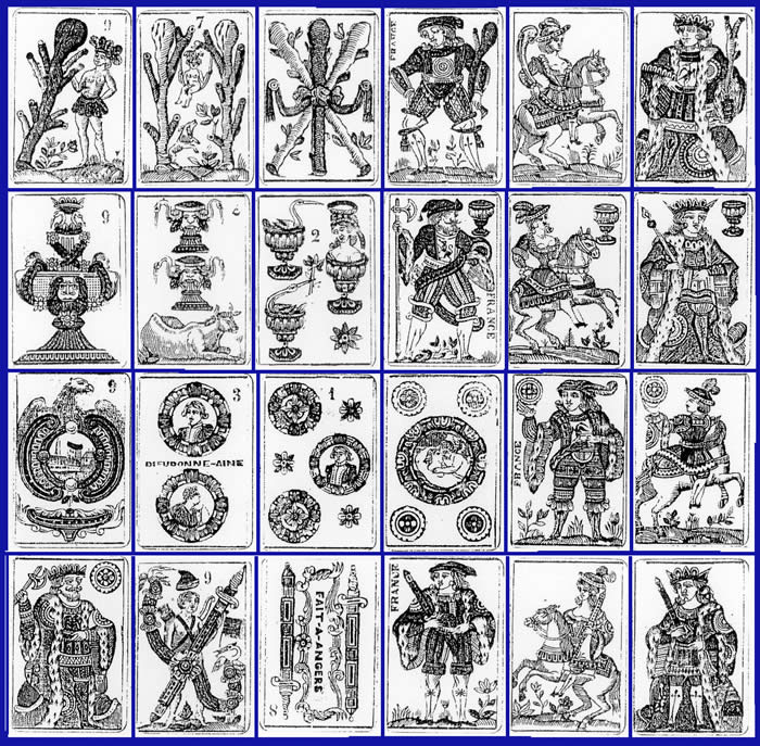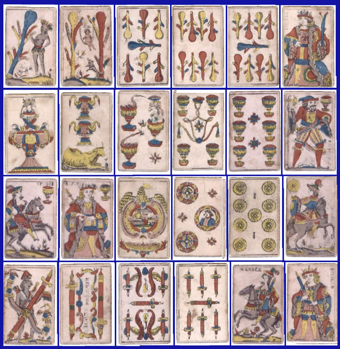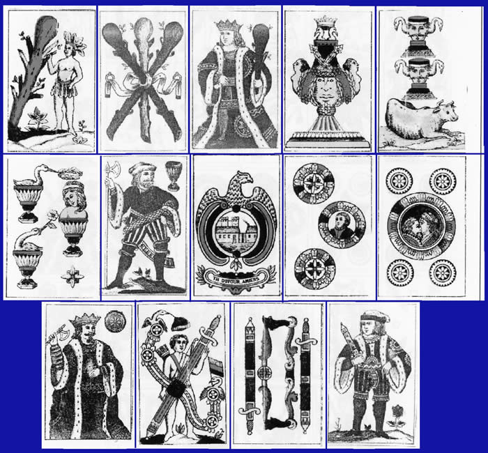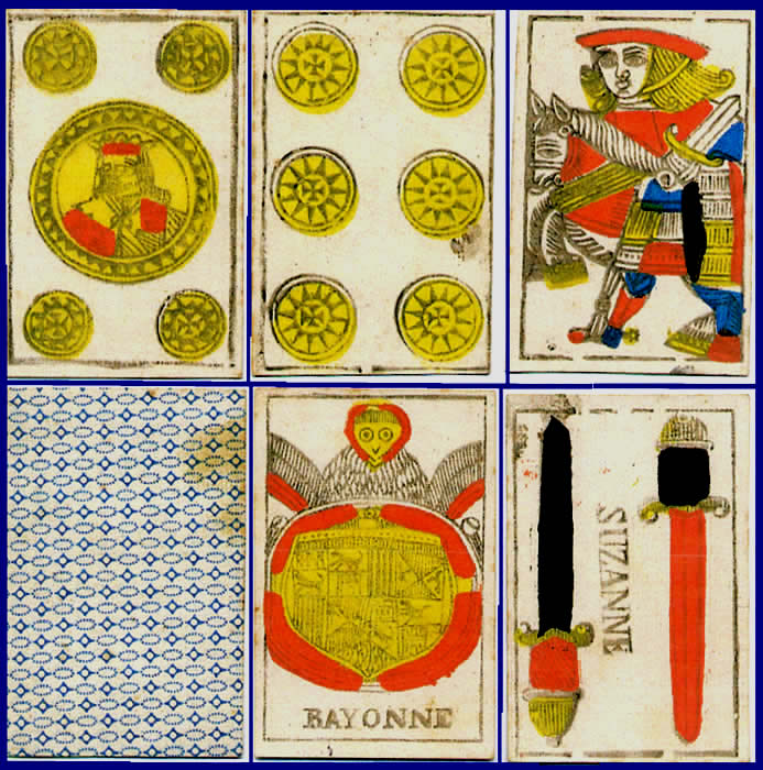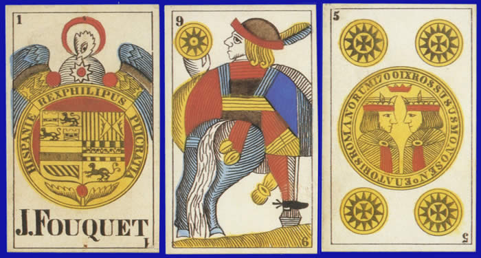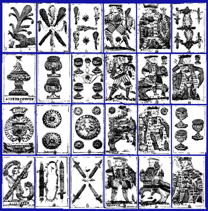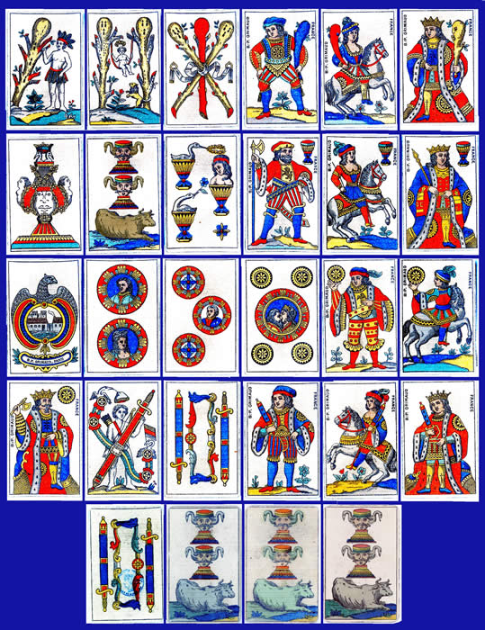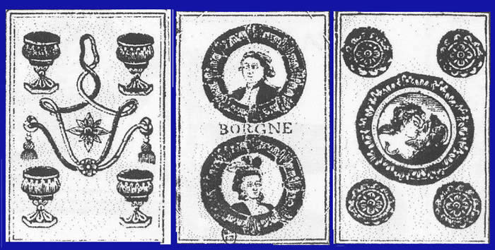 montre une « Vache », l’As d’Epée supporte les armes de France et de Navarre, l'As de Coupe est représenté par