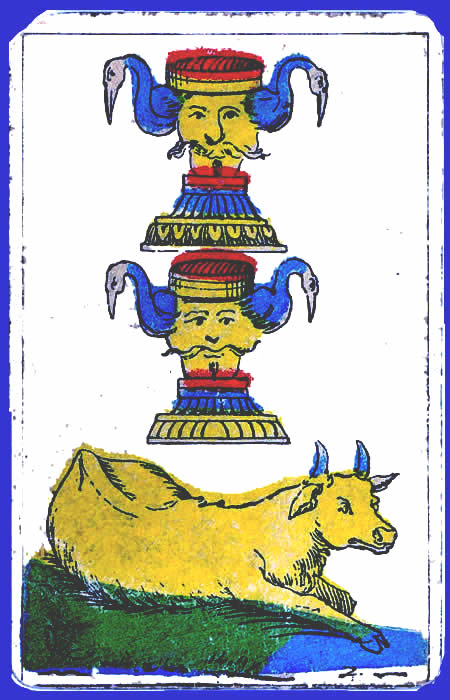 faut remarquer le Deux de Coupe car la Vache regarde à gauche, il nous semble que c'est le seul portrait à