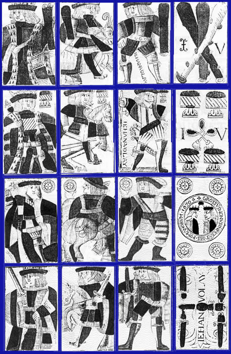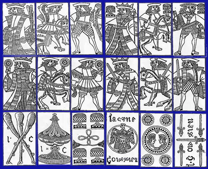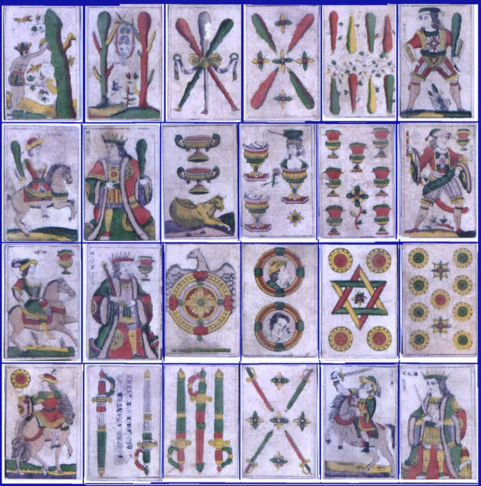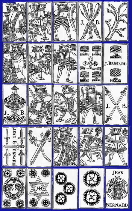 ont été refaits, la gravure est plus fine, le visage et les membres des cartes à figure sont teintés de rose. Il existe de