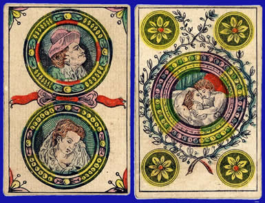 40x82mmuenviron. Dans ce portrait nous voyons deux cartes le Deux de Denier et le Deux de Coupe, sur le premier rnous pouvons y voir un « Borgne », sur le deuxième il n’y a pas de « Vache ». Nous avons donc qu’une Luette, si nous